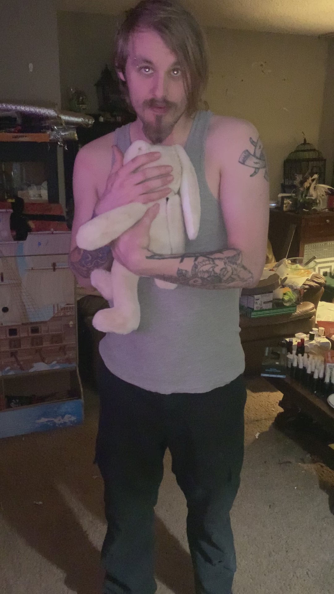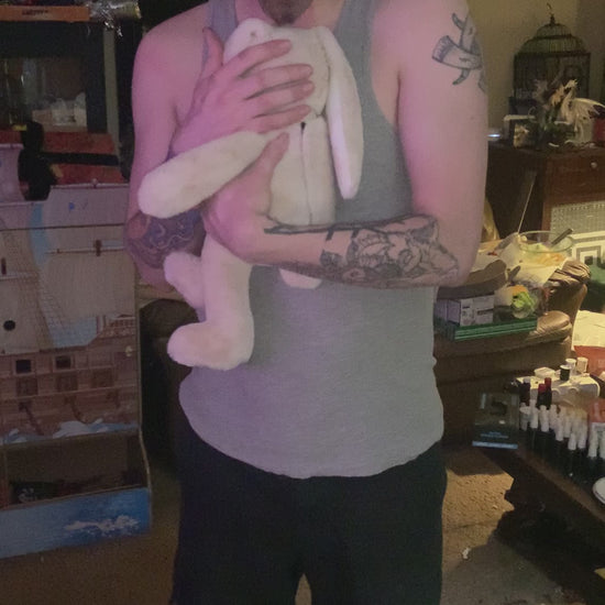 16” rabbit plush that “spits” water or whatever liquid of your choosing. Rabid rabbit has bloodied human eyes and teeth for a more horrific appearance. They come with a water bottle hidden in a velcro secured pocket accessible in the back.