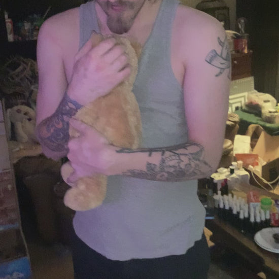 16” teddy bear that “spits” water or whatever liquid of your choosing when slightly squeezed. Scaredy bears have bloodied human eyes and teeth for a more horrific appearance. They have a refillable water bottle hidden inside a velcro secured pocket accessible in the back. Please note that bear color will vary.