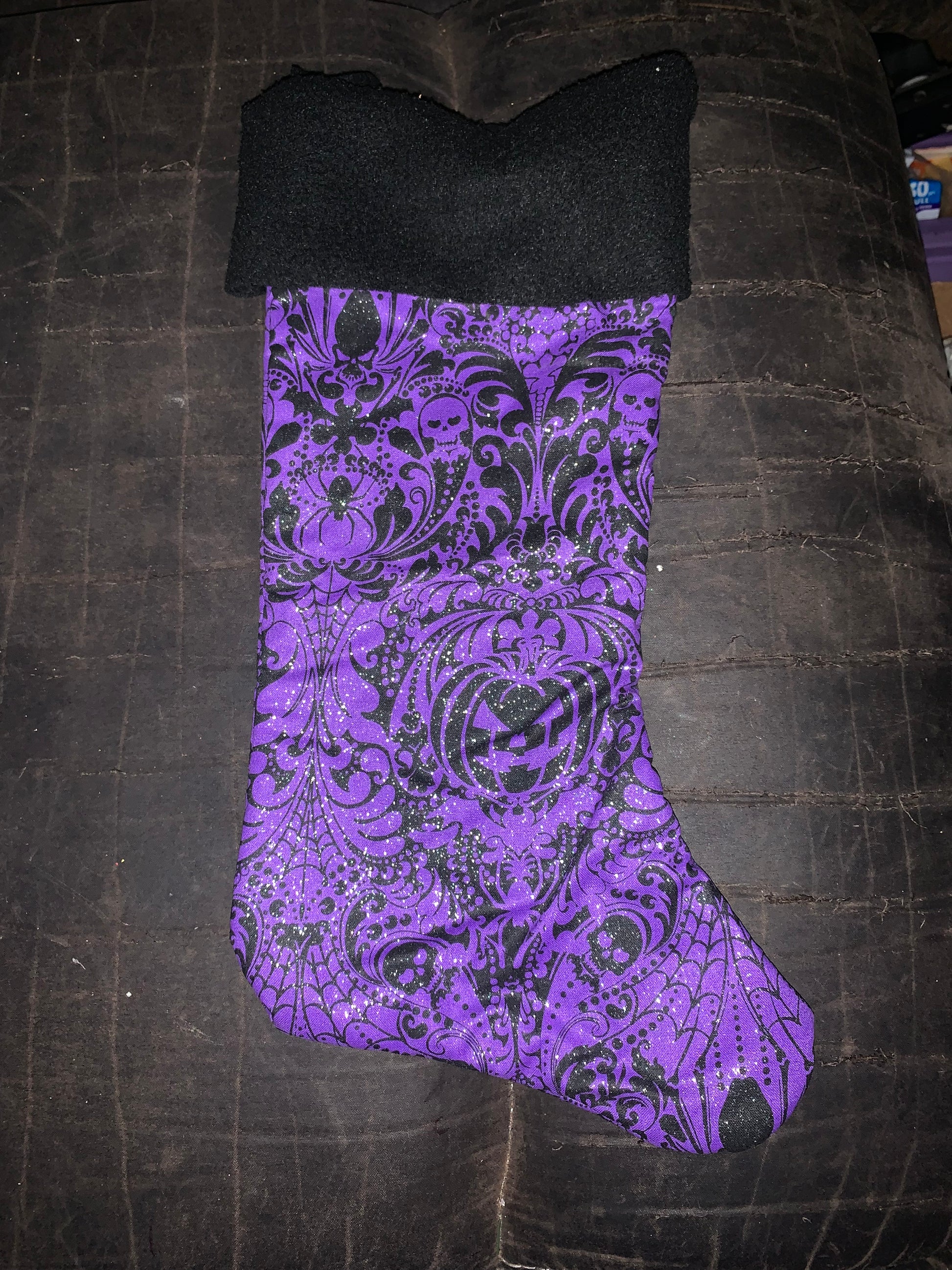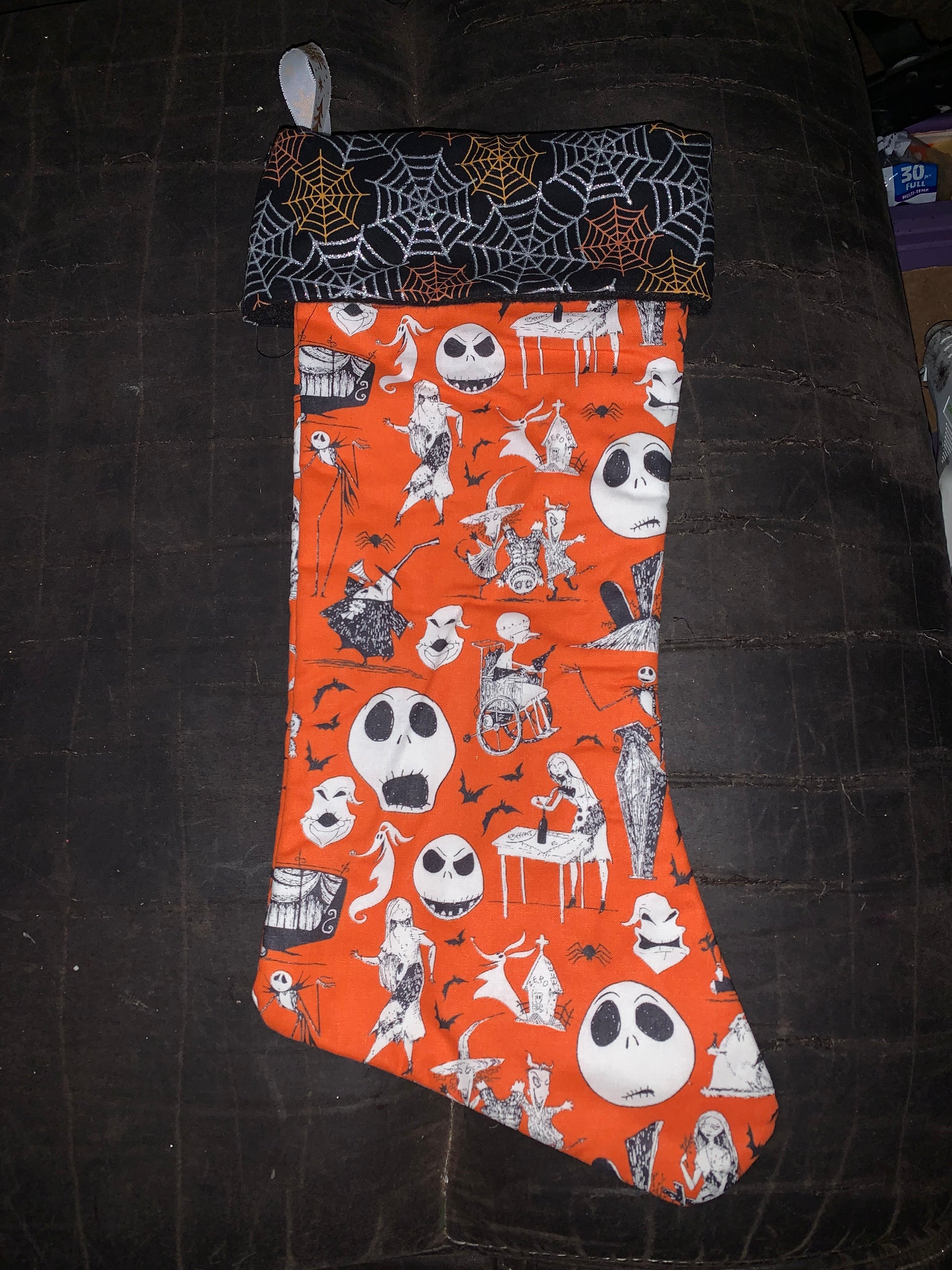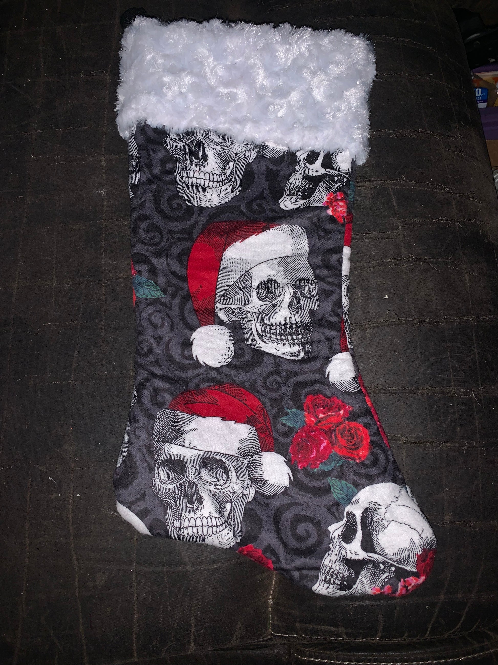 Seasonal spooky holiday stockings. Made from cotton and fleece, lined for thickness. Comes in multiple prints to choose from. Some prints have limited quantities for order available, please email for inquiries. Roughly 7” wide by 18” long