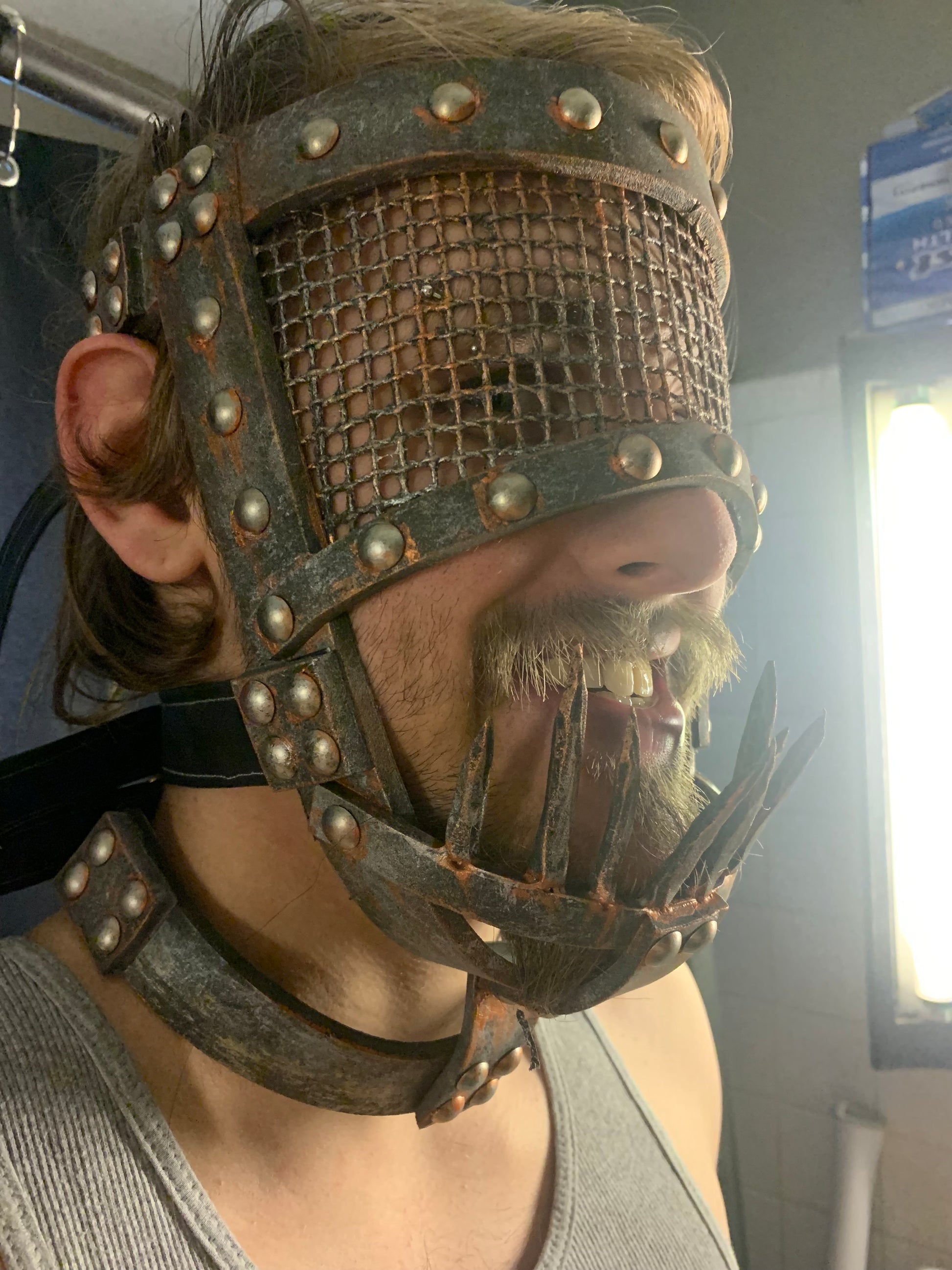 Aged steel in appearance this EVA foam fabricated head cage fits snugly with the attached faux leather straps fastened by 2 D rings for adjustability and comfort.